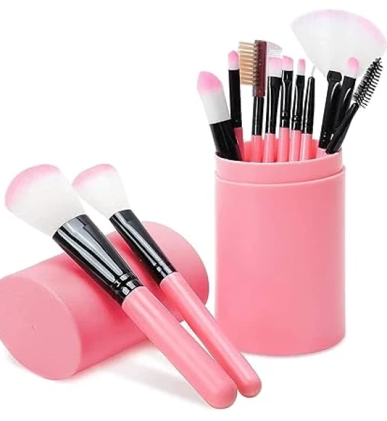 Makeup Brush Set With Storage Barrel – Pack of 12 (Pink)